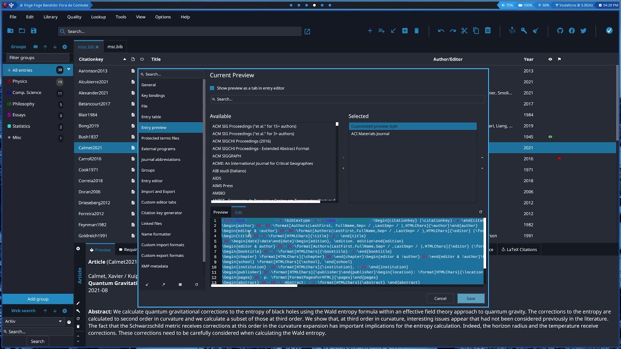 5. I was looking for something beyond that, as I’m currently doing research which I will use to write my master thesis (in theoretical Physics, in case somebody in the field has some tips). I know that this is heavily dependent on the work you are doing, but having some idea on the groups that people define, their commenting scheme both in Jabref and in the PDFs, their visual overlay, usage of the Jabref special groups, etc. would be great, because I’m simply replacing my folder full of PDFs to a Jabref window full of PDFs, which isn’t a major improvement, but what I feel like the first step towards a very organized library.
